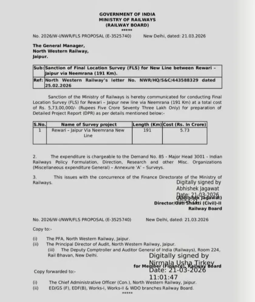 नई रेलवे लाइन का सर्वे: रेवाड़ी से जयपुर तक, नीमराणा, बहरोड़, कोटपूतली, पावटा और शाहपुरा को जोड़ने वाली नई रेलवे लाइन का सर्वे शुरू होने जा रहा है। जैसे ही इस परियोजना की खबर फैली, पूरे क्षेत्र में खुशी की लहर दौड़ गई है।